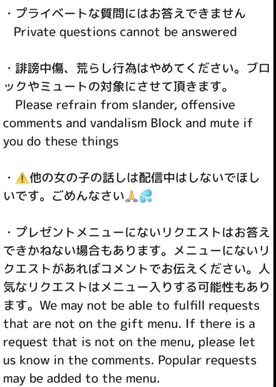 日本の法律を遵守した形で配信させて頂いておりますので過度なリクエストにはお答えできない場合がありますがご理解下さい。 Legal compliance Live. 合法合规直播 ライブ配信映像の写真撮影、録画行為はご遠慮くださいღ動画や画像を無断転載、販売等、流出させた場合は、肖像権・著作権の侵害として差止請求と損害賠償請求並びに刑事告訴を求める手続きをさせて頂きます。 No unauthorized reproduction. 禁止转载 配信エラーでの返金対応について チケットチャット開始5分後、服を脱いだ状態でチケチャ成立となります。それ以降不具合等で中断した場合でも返金対応は致しかねますのでご了承下さい。 画像や動画の無断転載、販売等は禁止しております。 発覚次第、サイトへの報告、肖像権と著作権侵害等での開示請求、損害賠償請求、刑事告訴を致します。 当コンテンツは日本の法律を遵守した配信の為、性器の露出は出来ません。又、過度なリクエストの強要、発言等は無期限の視聴制限致します。
